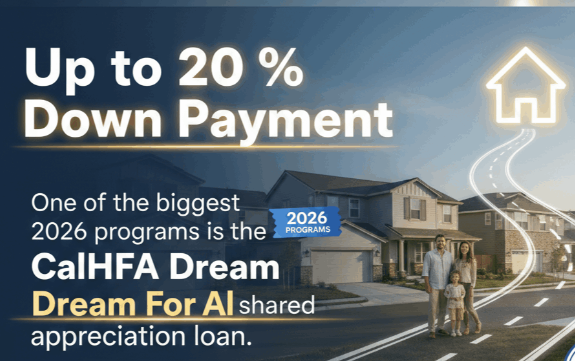 One of the biggest 2026 programs is the CalHFA Dream For All shared appreciation loan. - Offers up to 20 % of the purchase price toward down payment or closing costs (max ~50,000).Works as a shared appreciation loan — you repay the amount plus a matching share of home value gain when you sell, refinance, or transfer the home.Registration (lottery system) is slated for Feb 24 – Mar 16, 2026 — prepare early.Often prioritized for first-time and first-generation buyers.